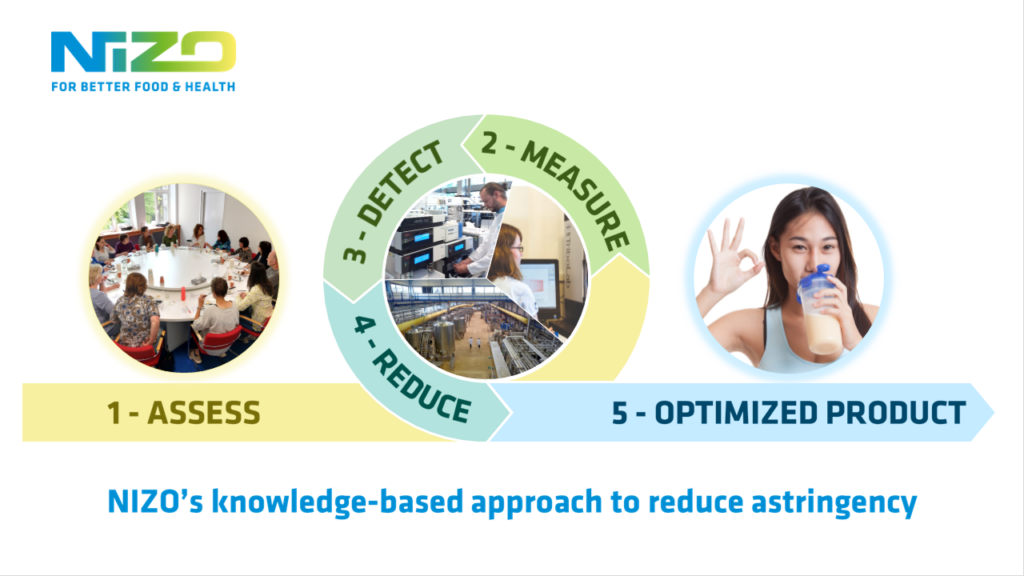 One innovative new technique that could be promising for astringency is biopurification. This is a form of fermentation where the fermenting microorganism is specifically chosen for its ability to degrade a particular, unwanted molecule rather than to create typical fermentation products. Biopurification has already been used successfully to reduce off flavours in plant-based products. Recently, researchers at NIZO have begun using biopurification to target astringency-causing molecules, and the early results are very encouraging.