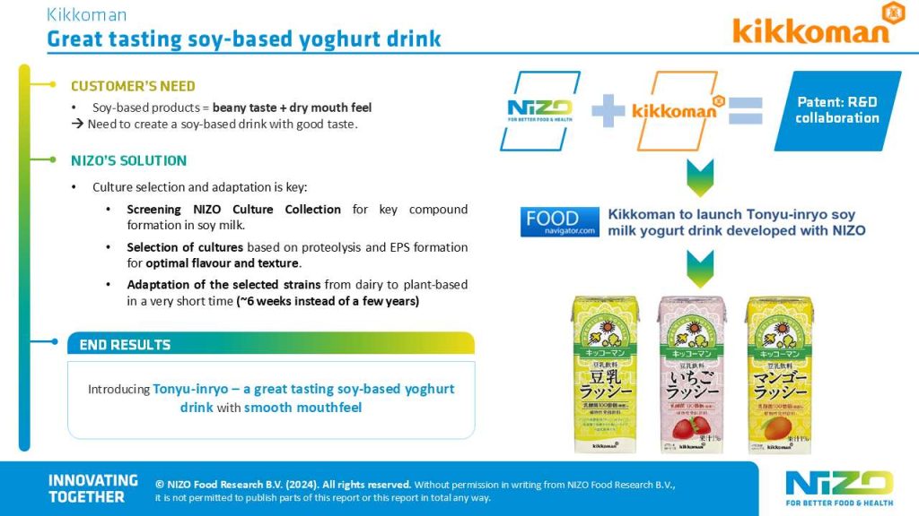 NIZO supported Kikkoman to remove the beany taste & dry mouth feel and develope a great tasting Tonyu-inryo soy milk yogurt drink…