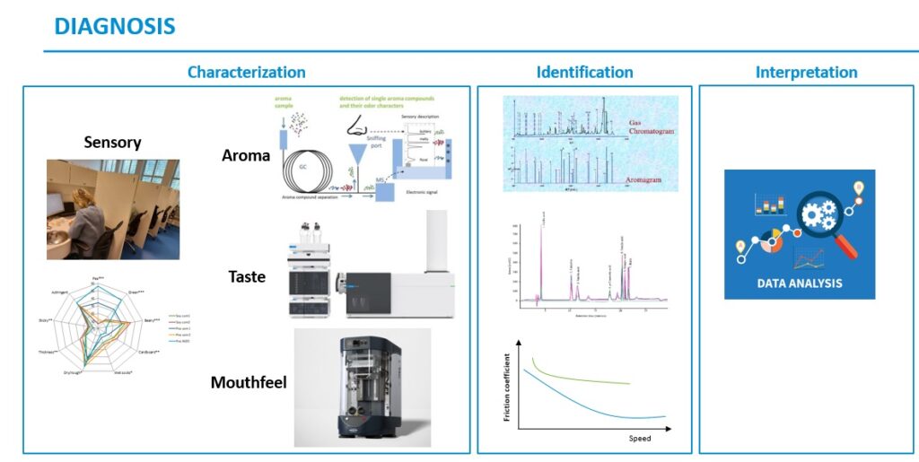 Systematically diagnosing the root cause of a flavour issue means you can develop much more optimal solutions and a much better tasting product. Flavour is very complex, combining taste, aroma, texture, mouthfeel and how the food interacts with saliva and the tongue. We have done a lot of research into the compounds that can cause off-flavours in plant-based foods. One thing we found is that the most abundant ‘off-flavour compound’ isn’t always the actual cause of an off-flavour. Perhaps a less abundant compound is more powerful, or the product matrix promotes/suppresses the release of certain compounds into the mouth during eating. A more holistic approach to the analysis helps you better understand such cross-modal interactions between texture, mouthfeel and the perception of flavours.