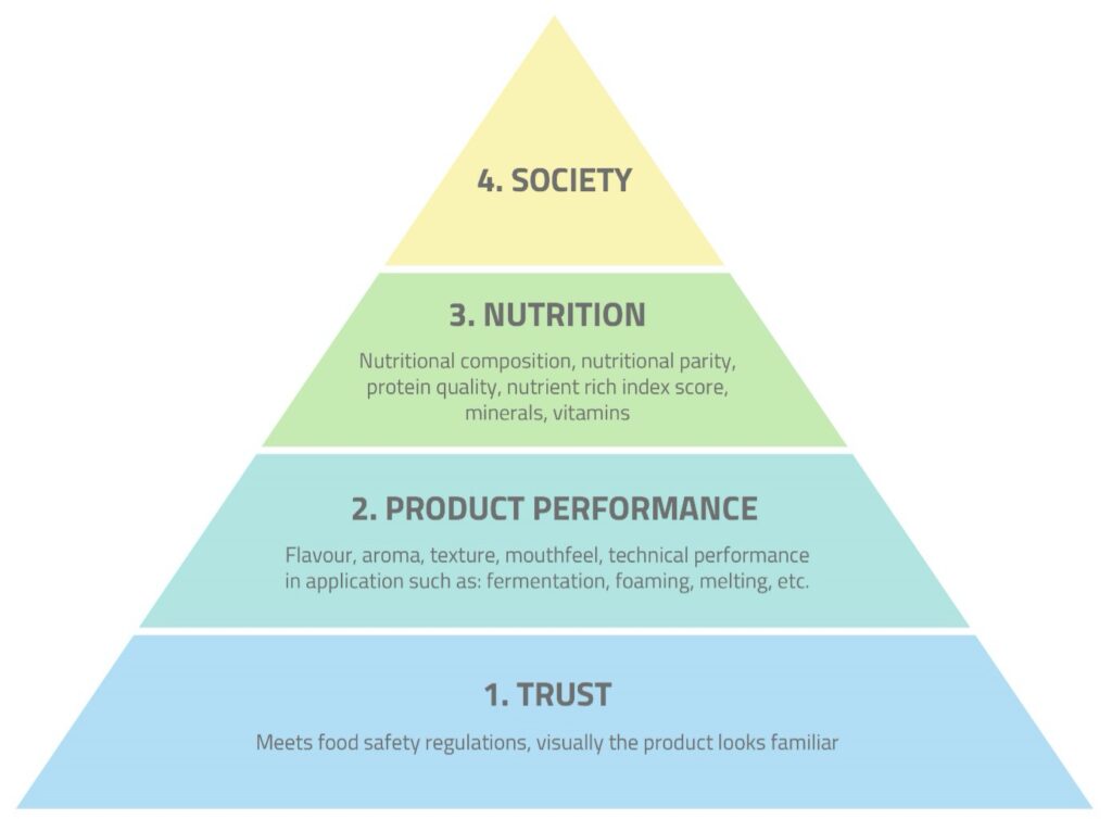 Different product types move through this pyramid at different rates and the order of the nutritional and societal levels in particular will depend on the individual consumer and brand. But in moving up the pyramid, new generations of products have to at least maintain the performance in the lower levels. In other words, delivering nutritional parity or a more sustainable product cannot come at the expense of the sensory experience. The challenge for the plant-based sector is that many plant protein options have issues when it comes to their sensory qualities.