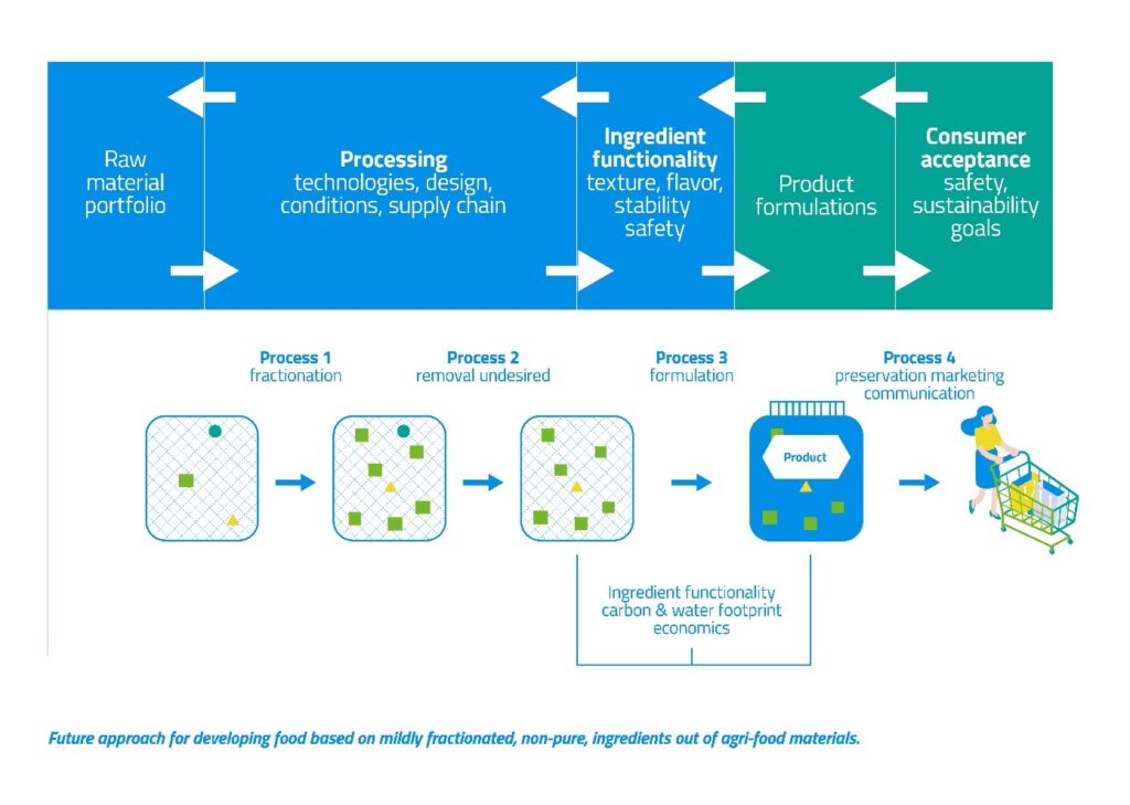One such idea is to move away from extreme purification of raw materials. What if we instead split raw materials into fractions that are rich in a particular nutrient but still retain some of the matrix of the raw material from which it is derived? So, legumes could be processed to fractions that are 50 or 60 protein but still contain, perhaps, sugars, starches, fats, etc. This could increase the proportion of the raw material that makes it into food applications, saving a great deal of energy.