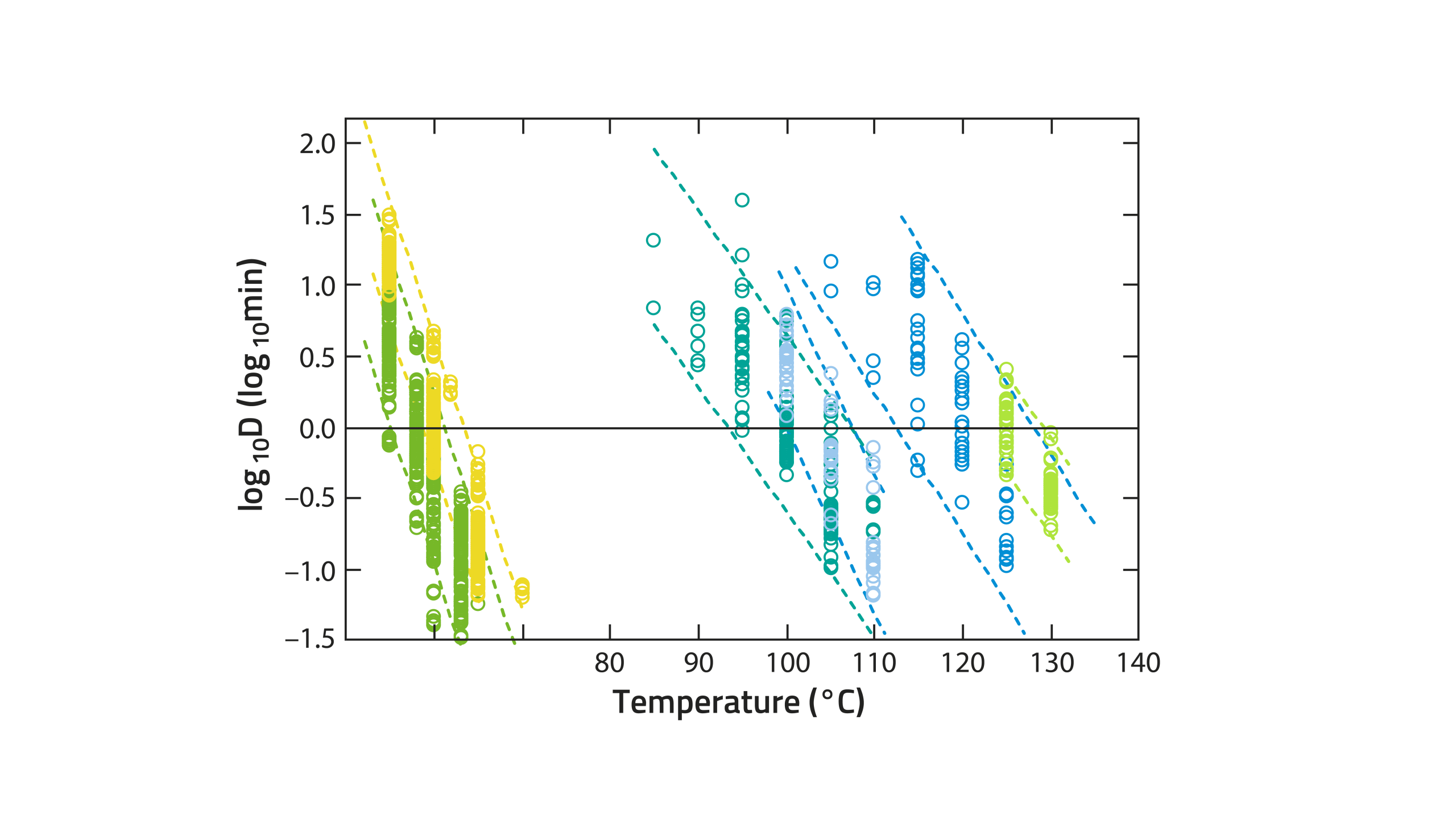 MW-B: Modelling can be extremely useful at different stages of product development. At the very early product design stages, you can use in silico predictive modelling to map out potential bacterial risks by calculating microbial inactivation (Figure 1) and growth. The mapping takes into account the boundaries of the product you want to make: everything from the processing conditions to the desired characteristics, such as the water activity, the pH, and even how your product will be stored by the consumer: refrigerator, freezer, in ambient temperatures, etc.