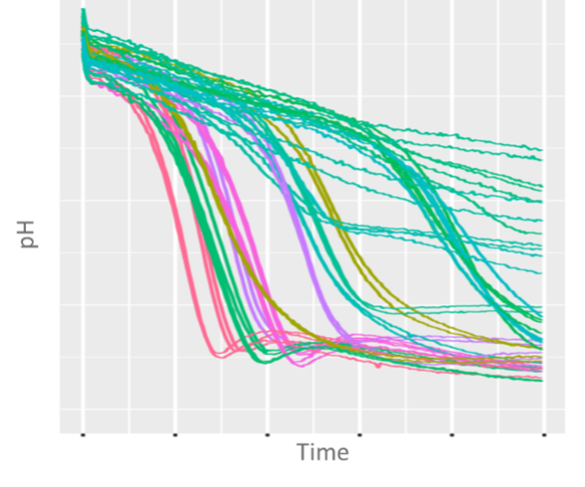 High-throughput screening on a culture collection can provide key insight, such as these acidification curves for various bacterial strains in a plant protein emulsion.