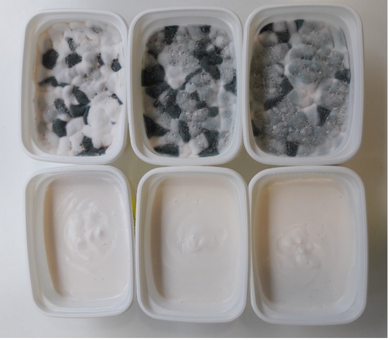 Plant-based cheeses, after 6 weeks of storage at 6 °C. The top row cheeses were acidified with lactic acid and showed extensive mould growth while the fermented samples in the bottom row showed none.