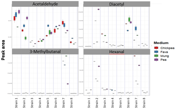 The production of desired flavour compounds (acetaldehyde, diacetyl, 3-methylbutanal) as well as off-flavour (hexanal) removal depends on both bacterial strain and substrate.