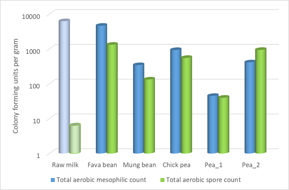 A large proportion of the total microbial count in plant-based ingredients consists of spores from bacteria such as Bacillus subtilis, B. licheniformis and B. amyloliquefaciens, but we alsofound B. cereus, and Geobacillus stearothermophilus. There can be as many as 1000 spores per gram in plant-based ingredients. These spores can survive high heat treatments and, upon germination, can go on to produce (heat-resistant) toxins that present a health risk. This contrasts with spore counts of around 1-10 per ml for raw milk, where the majority of bacteria are inactivated by pasteurisation.