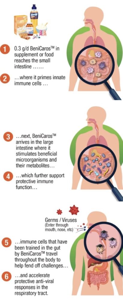 First is the direct effect on the immune system. Our ingredient’s complex chemical structure is stable in the stomach (small intestine) and can be sensed by cells of the innate immune system that actively monitor the content of the small intestine. These cells are thus primed, or ‘trained’. Some then migrate to the respiratory tract, passing on the lessons learned and improving local responsiveness.